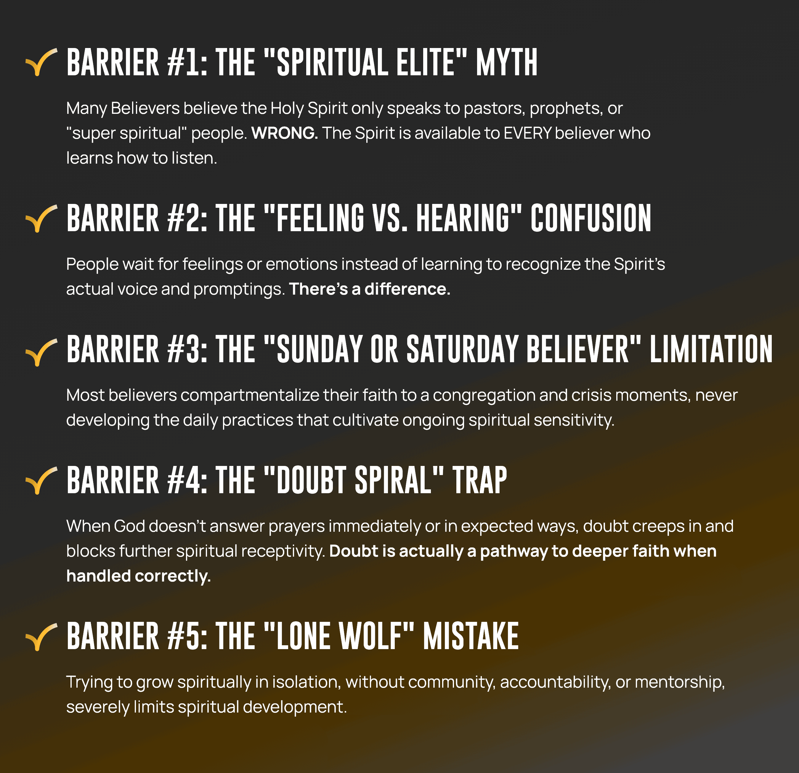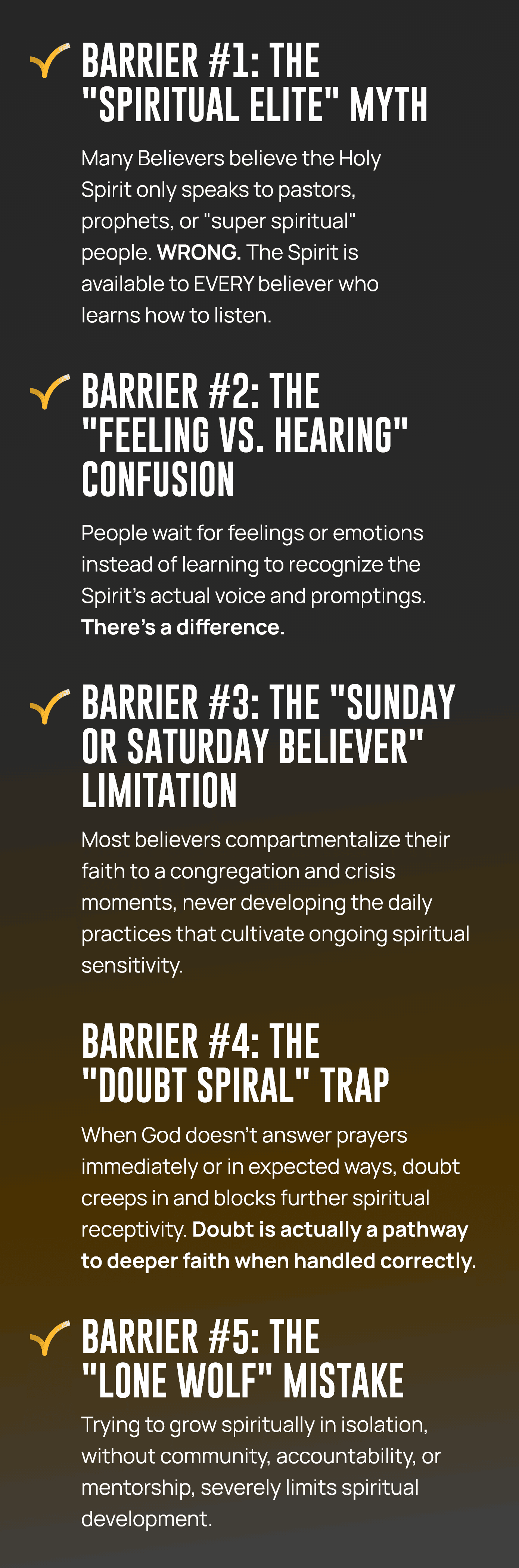 After 30+ years of walking with God and 18 years of intensive Holy Spirit encounters, I've identified the five critical barriers that prevent most believers from experiencing the Spirit-led life: