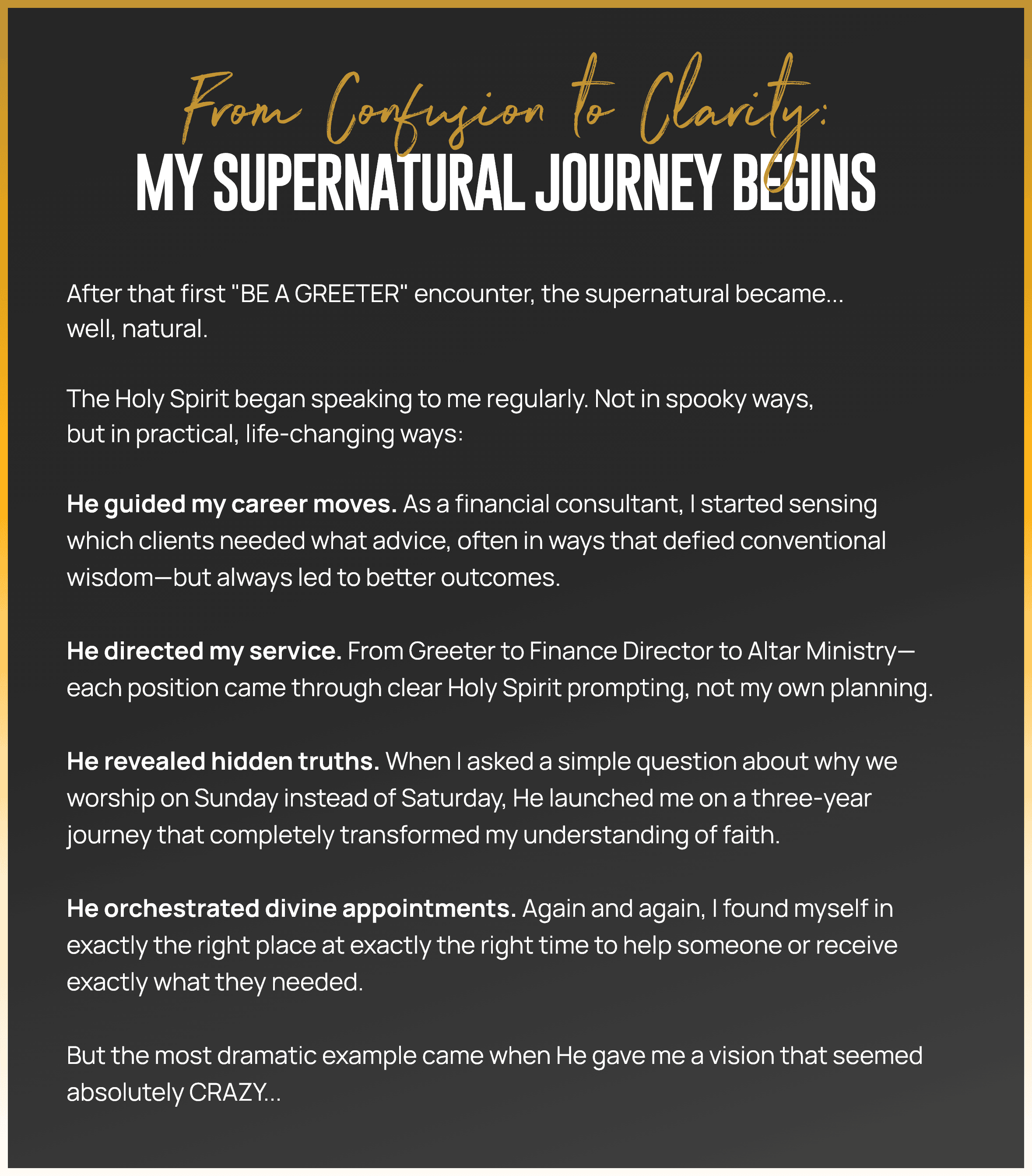 Over the next 18 years, I discovered what I now call the "Divine Guidance Method"—a way of living where the Holy Spirit becomes your personal navigation system through life's confusion, chaos, and challenges.